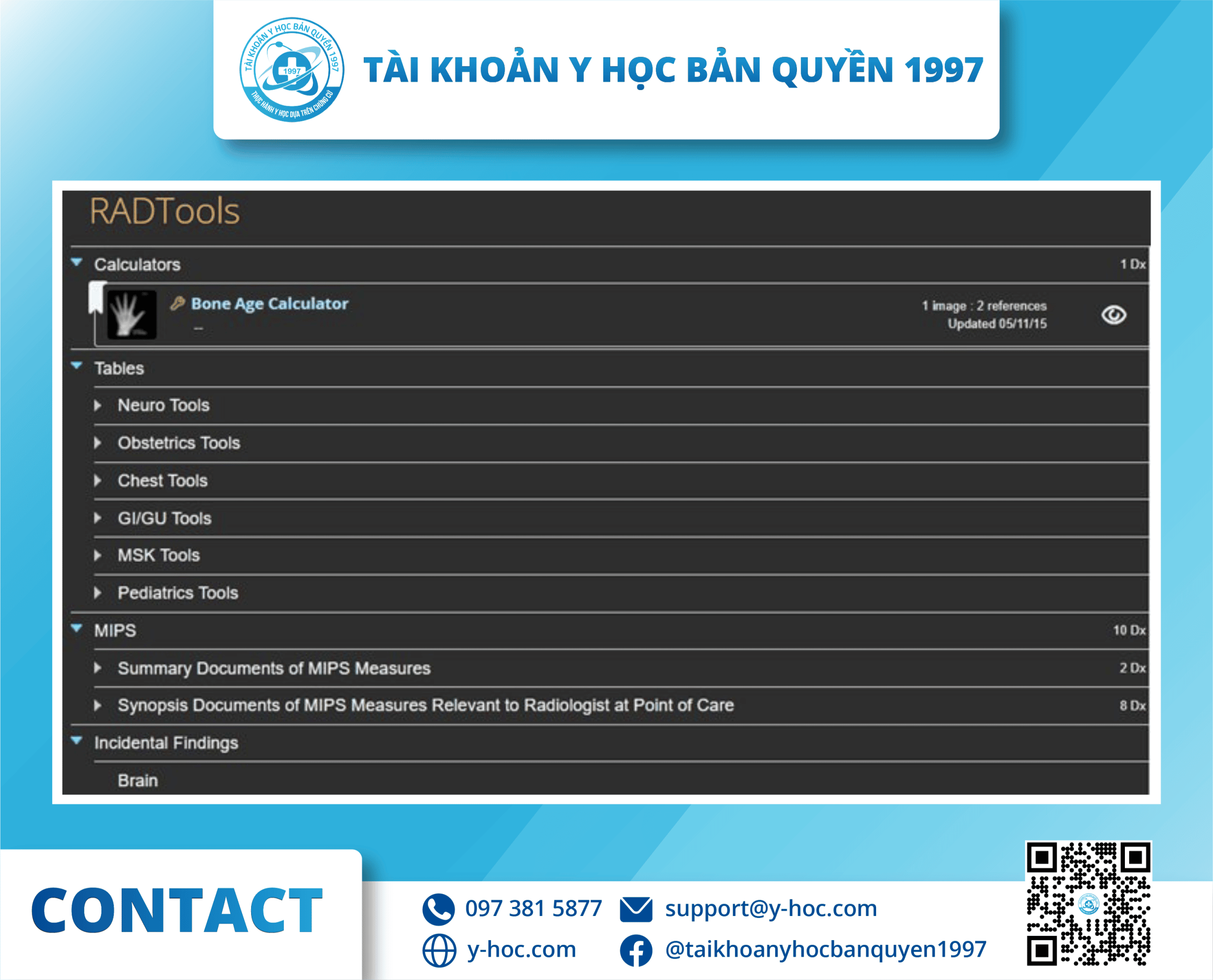 - RADTools: áp dụng các bộ tính lâm sàng, bảng phân độ, bảng tính điểm lâm sàng khi thực tập tại các bệnh viện, cơ sở y tế.