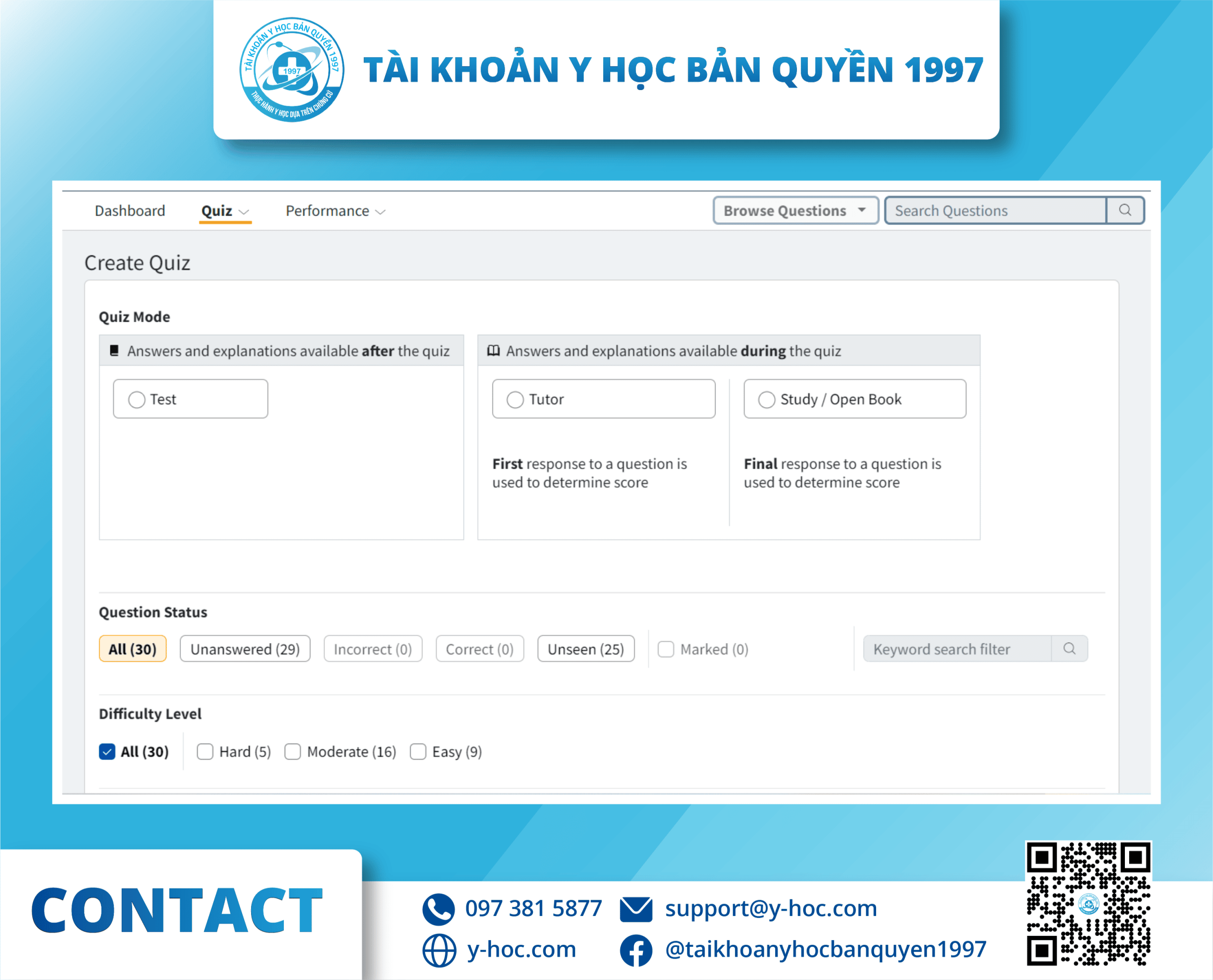 - Quick Start Quiz: tạo nhanh một ngân hàng với 10 câu hỏi chưa được trả lời, tất cả chủ đề, và ở chế độ học tập