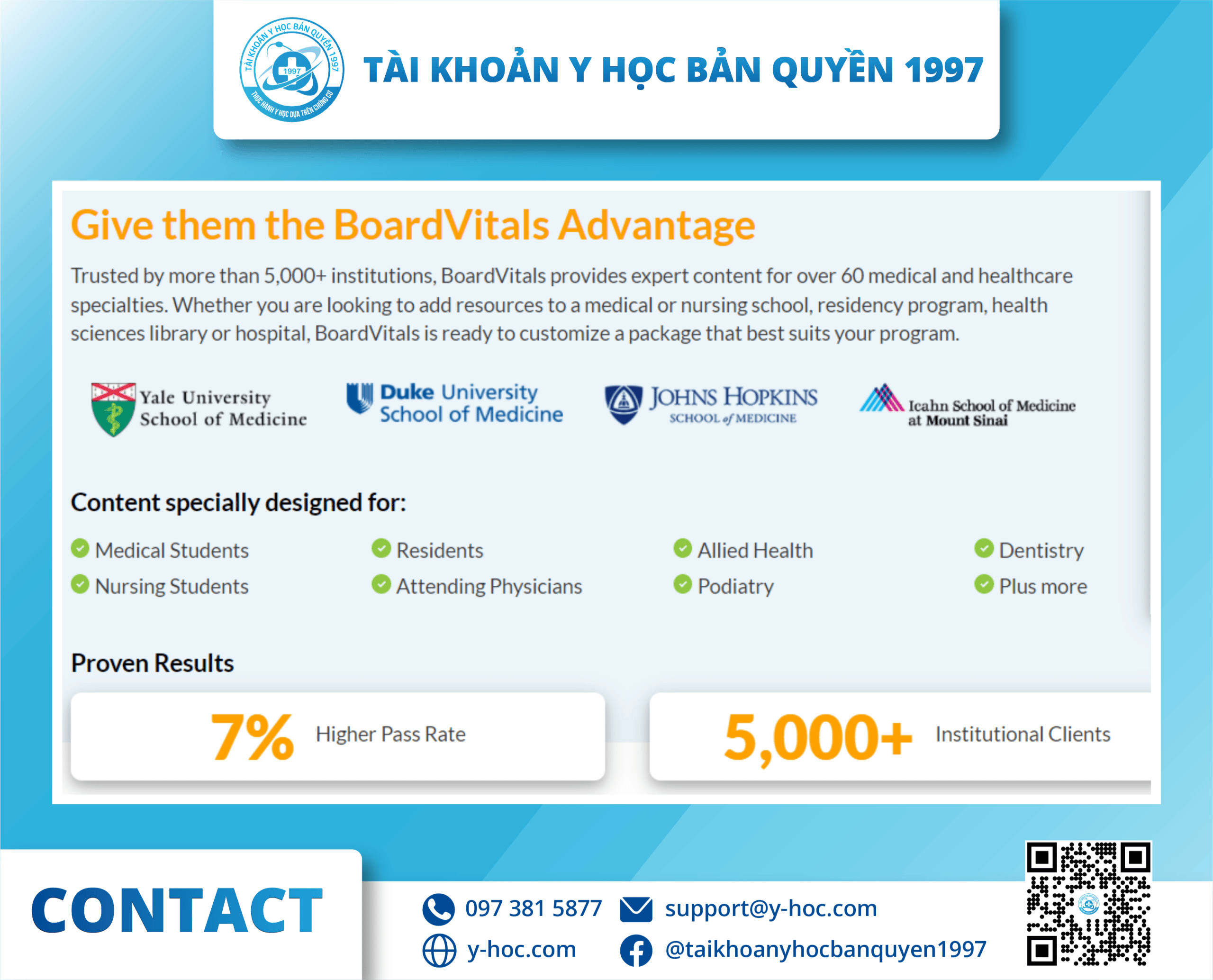 BoardVitals tập hợp nội dung từ các nhà xuất bản lớn như McGraw-Hill, Wolters Kluwer Health, và Wiley Publishers, trường đại học và xây dựng đội ngũ giảng viên, các chuyên gia chăm sóc sức khỏe hàng đầu đã tạo ra hệ sinh thái đào lớn nhất về y khoa. Nền tảng được xây dựng và phát triển với mục đích hỗ trợ các học viên chuẩn bị cho các kỳ thi cấp giấy phép, tái chứng nhận (MOC), chứng chỉ CME và các kỳ thi tại chức với nguồn tài liệu của hơn 30 chuyên khoa. Cho đến nay, Board Vitals đã đào tạo hơn 400,000 học viên và được lựa chọn bởi 5,000+ tổ chức uy tín như đại học John Hopkins, Yale, Duke, Cơ quan Quản lý Sức khỏe Cựu chiến binh Hoa Kỳ,…