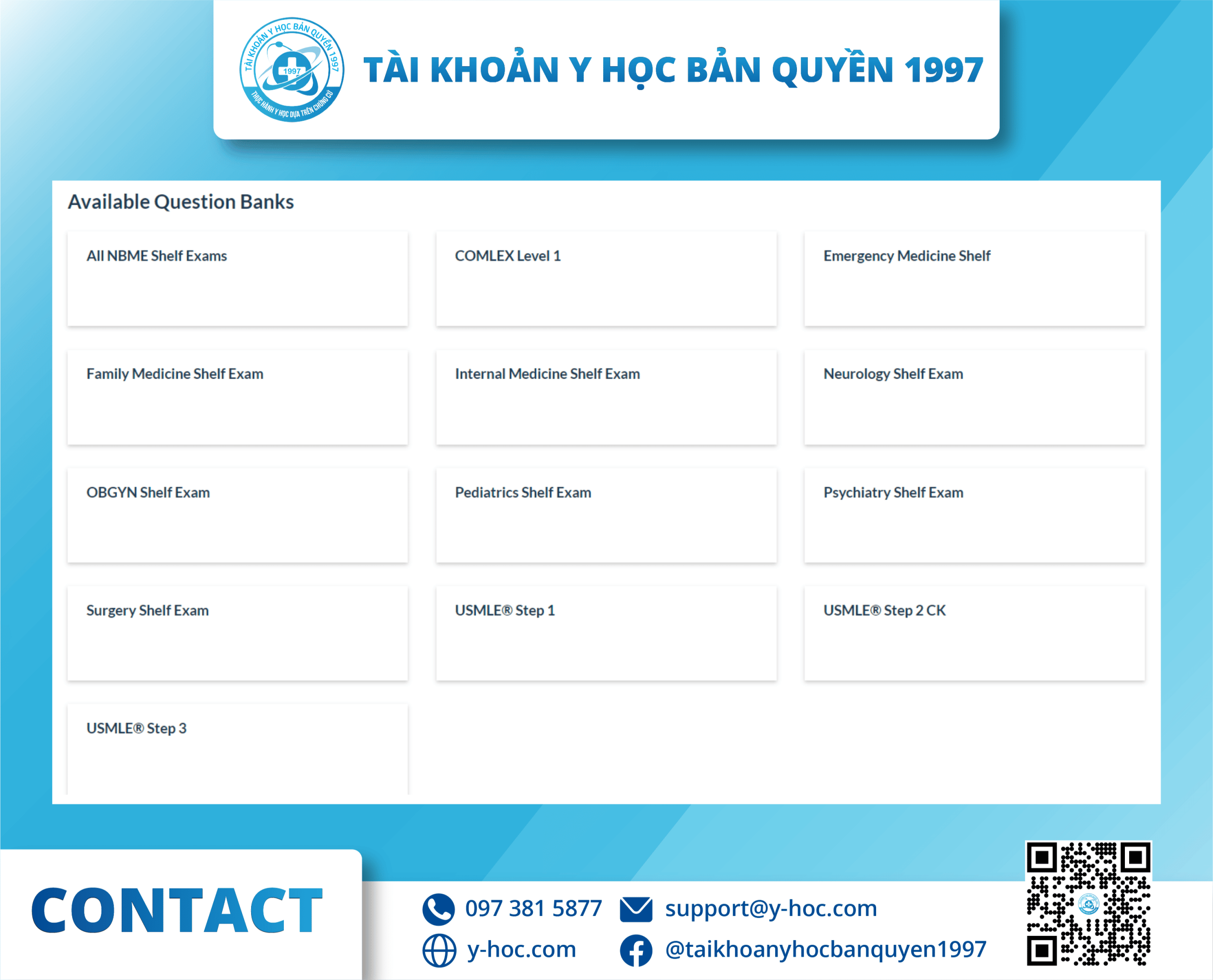 Từ USMLE và COMLEX cho đến NBME, sinh viên y khoa thông qua BoardVitals sẽ có sự chuẩn bị toàn diện cho các kỳ thi được tổ chức trong thời gian học tại trường y. Ngân hàng câu hỏi ôn tập và lời giải chi tiết được phát triển bởi các giảng viên, chuyên gia và nhà xuất bản hàng đầu nhằm vào từng kỳ thi cụ thể. Các công cụ cá nhân hóa và truy cập trực tuyến, theo yêu cầu cho phép nhóm này tùy chỉnh để tương thích với chương trình học của mình.