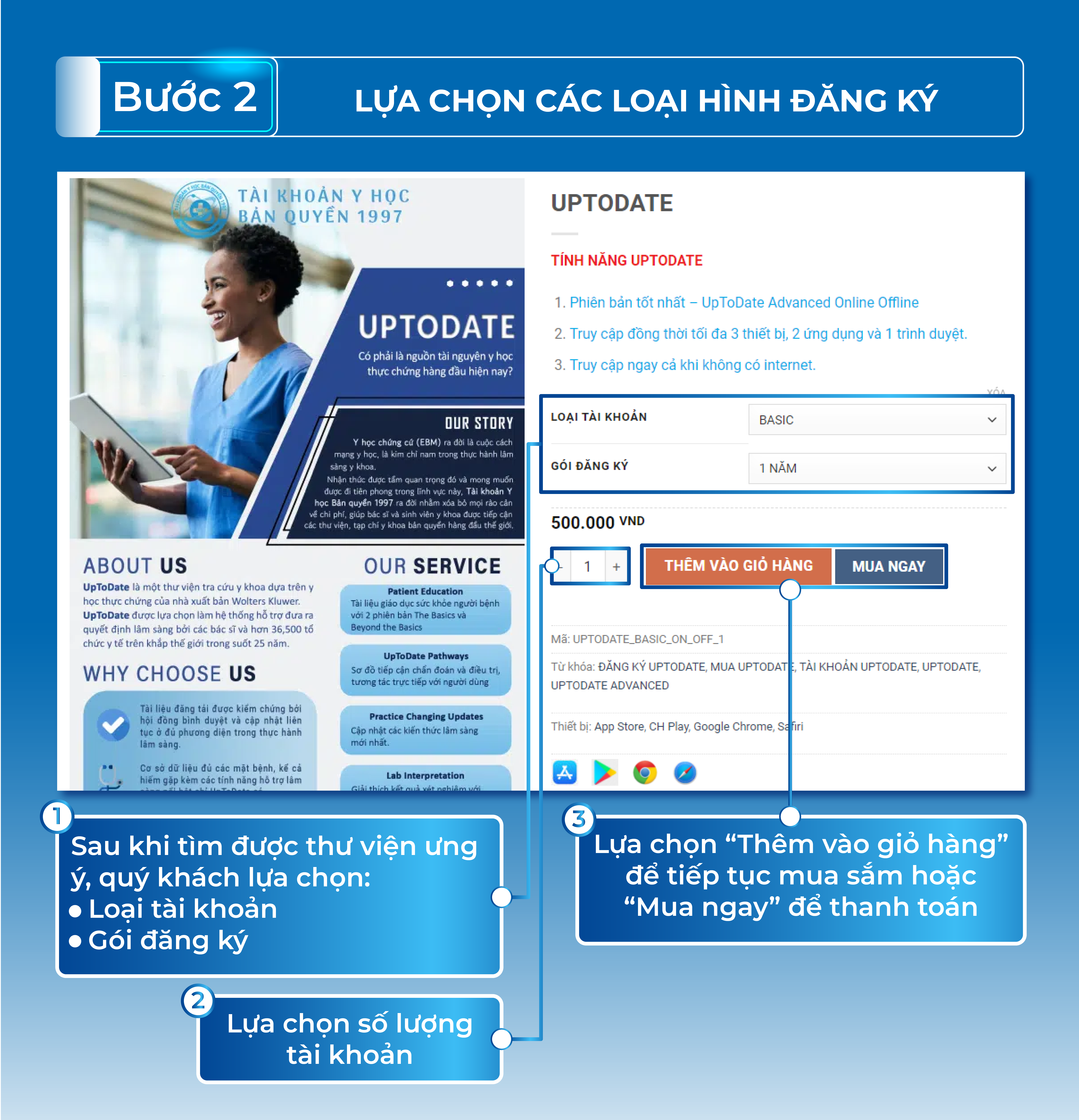 Là cách lựa chọn kiểu đăng ký tài khoản thư viện y khoa gồm đăng ký tài khoản mới hay gia hạn bản quyền trên tài khoản hiện đang sử dụng.