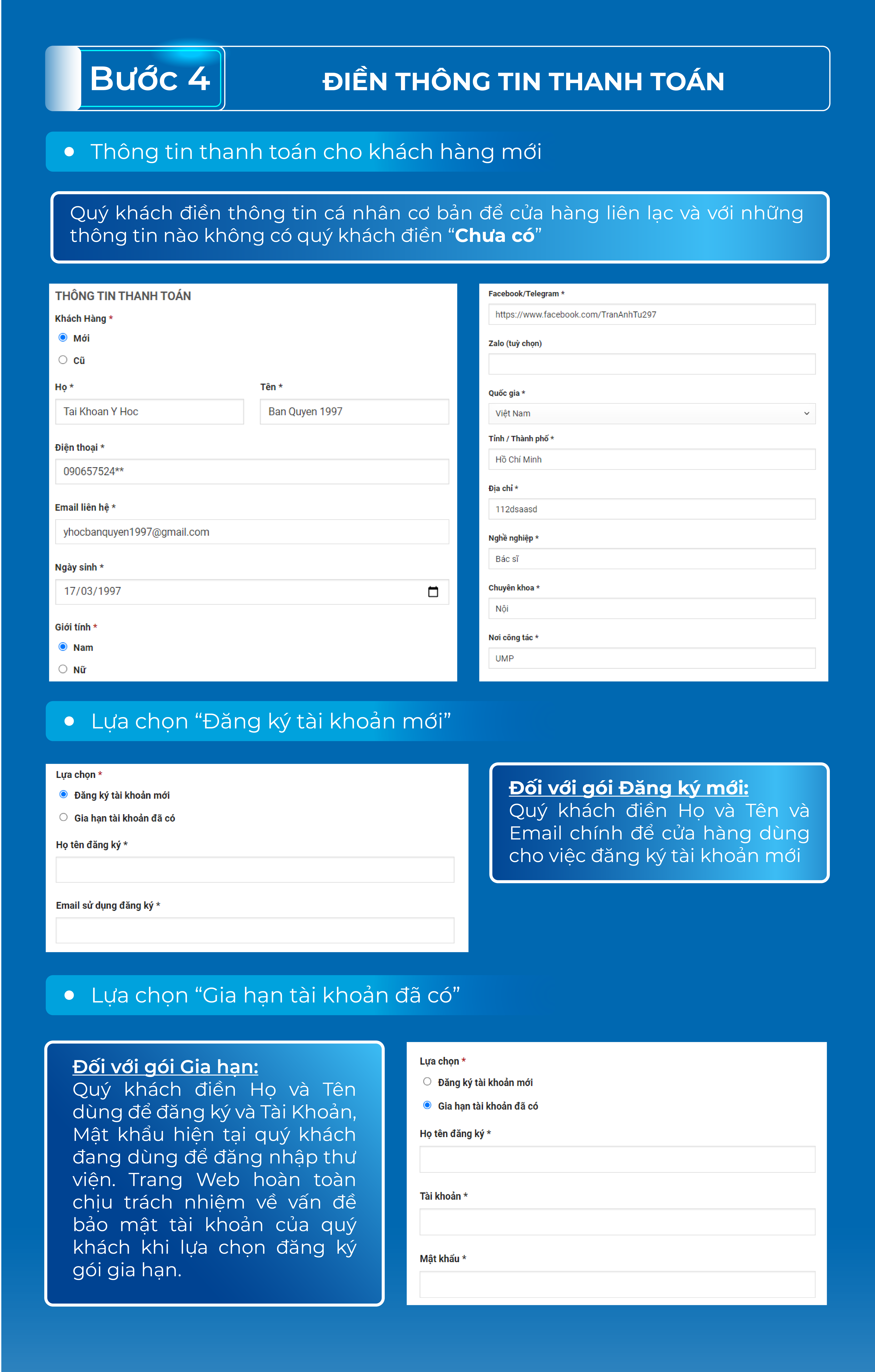 Khách hàng mới: Là khách hàng chưa từng sử dụng dịch vụ của thư viện “Tài khoản y học bản quyền 1997” qua các kênh bán hàng trước đây như: Fanpage, facebook cá nhân Admin Trần Quốc Phương. Quý khách vui lòng điền đầy đủ các thông tin vào các trường như hướng dẫn mô tả trong các trường để đảm bảo tối đa quyền lợi của quý khách hàng trong quá trình sử dụng dịch vụ. Chúng tôi khuyến khích toàn bộ quý khách hàng lần đầu tiên mua hàng trên trang web điền theo nhóm thông tin khách hàng mới này vì kênh cơ sở dữ liệu khách hàng cũ đang cập nhật nên có thể xảy ra lỗi và mất thông tin khách hàng, ảnh hưởng đến quyền lợi của quý khách hàng.